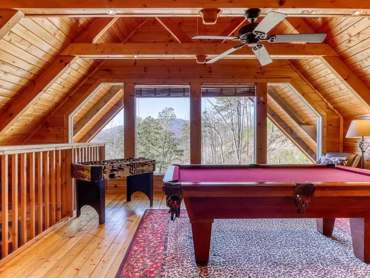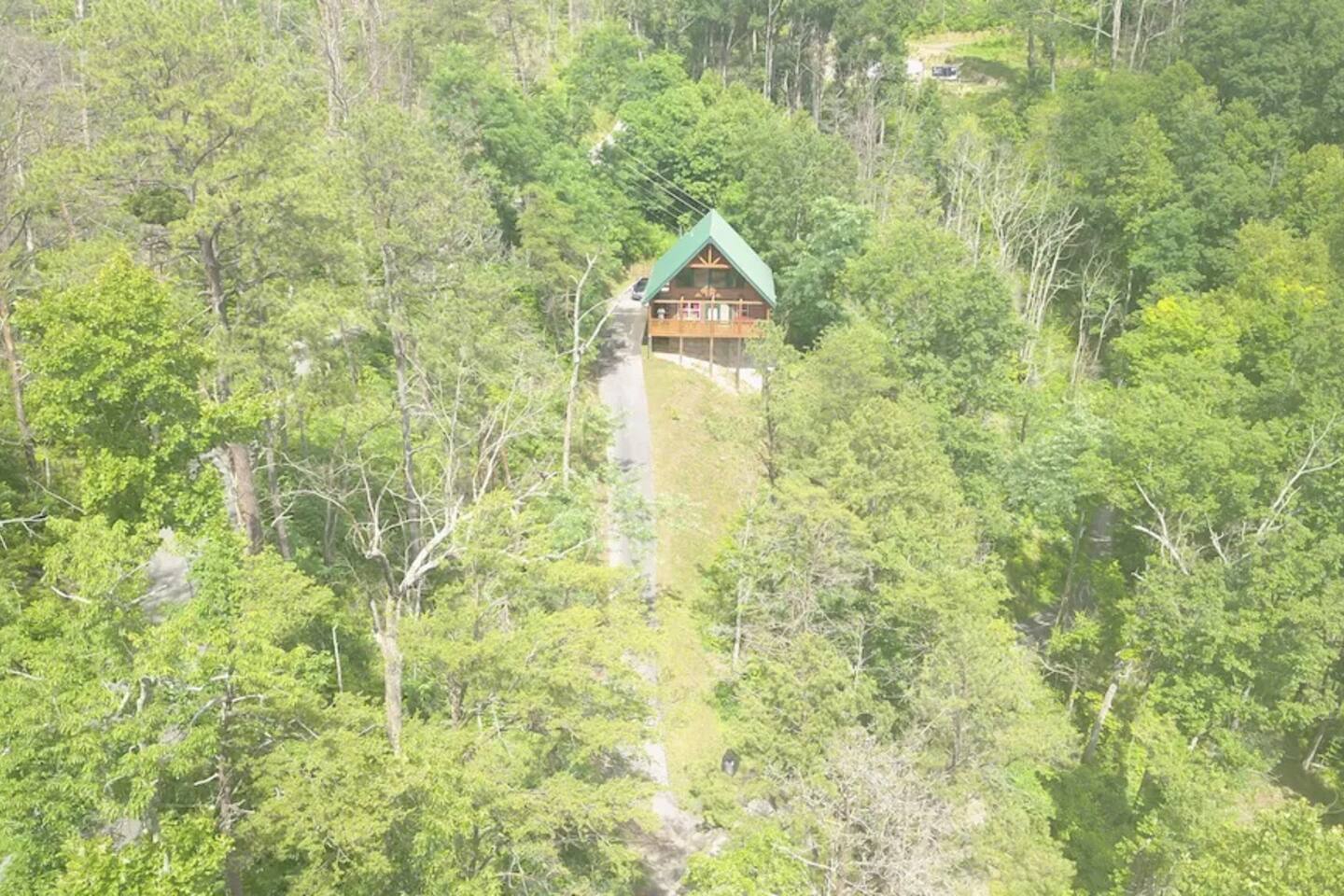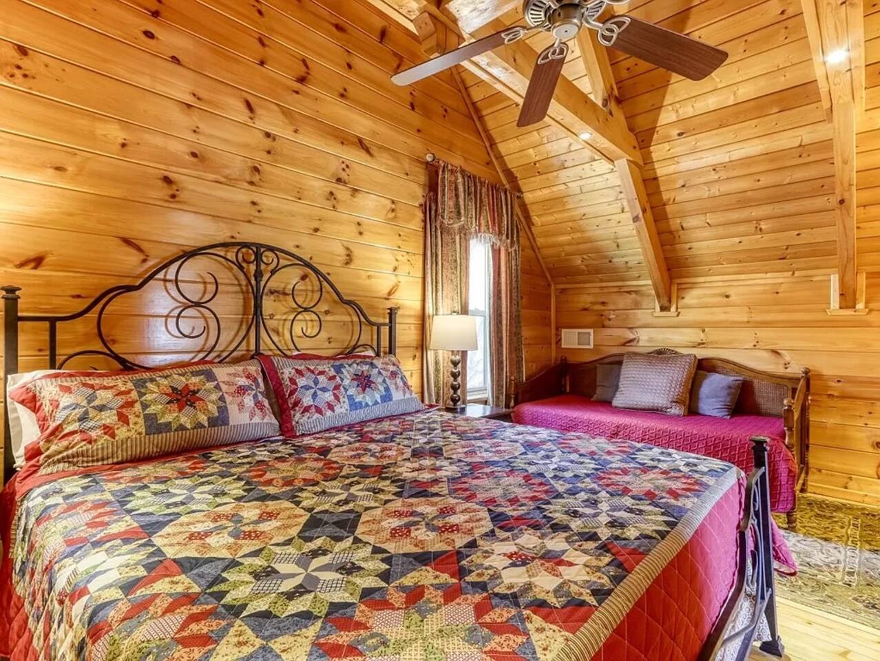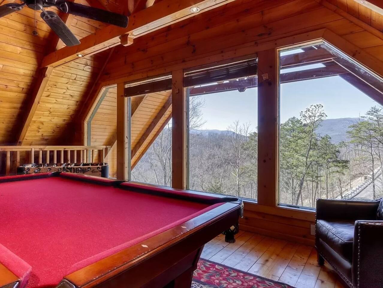 Le Beau Chalet Cabin features hardwoods throughout, has 2 bedrooms and 2 baths with one King/Queen/Twin with trundle bed, and common areas with a sleeper sofa (Max sleeps for 8), including a game room! It features a park-style BBQ grill. The deck is fitted with a hot tub to help relax after a day of adventure. The Cabin is conveniently located 1 mile away from downtown Gatlinburg. Perfectly located near all the attractions surrounding the Smokies State National Park. This cabin offers the "Best of both worlds"! A mountain perch in a serene 'getaway' location with tranquil views of the Smoky Mountain National Park and the eclectic 'downtown' activity that is Gatlinburg, just 1.1 miles away from traffic light #6 in the center of town. If you are looking for some activity there are so many options including the amazing Hiking trails at Roaring Fork offering several different levels of exertion and old-fashioned swimming holes for the kids (and those that are a kid at heart!). So many restaurants and shops to choose from just too numerous to mention. Chalet Features: * "Memory Foam" mattresses * High speed wireless internet access, for those of you who need to stay in touch (We provide computer) * Game room has pool table, foosball, wall mounted LCD TV and a Xbox 360 Live - bring your favorite game * Televisions: HD Flatscreen and DVD players。 * Gourmet kitchen includes stainless steel appliances and granite countertops. Not actually what you call 'roughing it' * YES flat turn-around driveway @ back side of cabin with plenty of parking. * Outdoor private hottub with panoramic views of the Smoky Mountains. * Bedrooms....Upstairs Master: King bed and twin daybed with twin trundle (sleeps 4 in master) Main level Second Bedroom: Queen bed. Main level living room: Queen sleeper sofa. * Non-smoking cabin Keywords: Cabin, Chalet, Views, Private, Gatlinburg prime location, Smoky Mountains, luxury accommodations, Hiking, Dollywood, Obergatlinburg HD t.v. Bears do visit the cabin on a regular basis. There is an active bear visit from our driveway! Please supervise children outside, keep car doors locked and cabin doors shut at all times. Do not leave food in your car or outside. All trash must be placed in the bear bins. Because we are in the woods, you will see bugs. Occasionally, a few make their way inside.